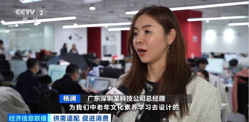 广东深圳某科技公司总经理 杨澜:这款学习机其实专门为中老年文化素养学习设计的,它结合了很多适老化的设计,包括AI大模型,体现智慧养老,落到一些具体的服务,帮助大家更好去感受学习的快乐。